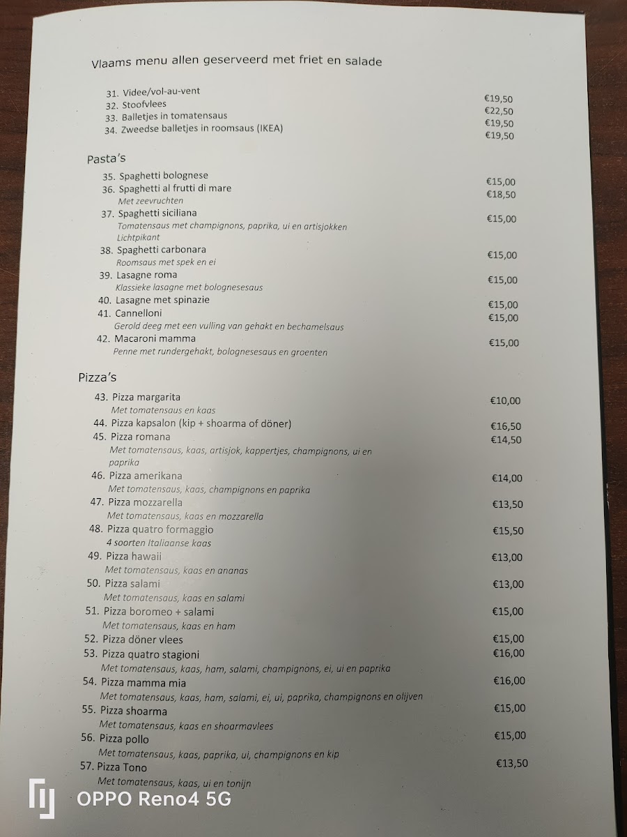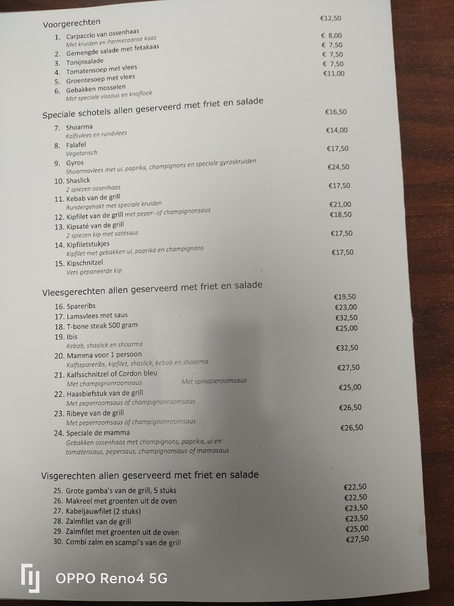 Steakhouse Mamma in Baarle-Nassau offers a straightforward yet enticing menu, focusing on high-quality meats and hearty sides. The star of the menu is undoubtedly the selection of steaks, cooked to perfection and complemented by a variety of sauces. Guests can indulge in the rich, tender flavors of their Rib-eye steak or enjoy a classic T-bone steak, both of which promise an unforgettable experience. For those seeking something more substantial, the Mixed grill provides an impressive combination of meats, perfect for sharing or a hearty meal. Alongside these dishes, the restaurant also offers lighter options, such as the Chicken Caesar salad, a crisp and satisfying choice. The accompanying sides, including fries and seasonal vegetables, elevate each meal to a complete dining experience. For those with a sweet tooth, the Coffee is a must-try, wrapping up the meal on a delightful note. Steakhouse Mamma's menu blends traditional flavors with a welcoming atmosphere, making it a great choice for meat lovers and casual diners alike.